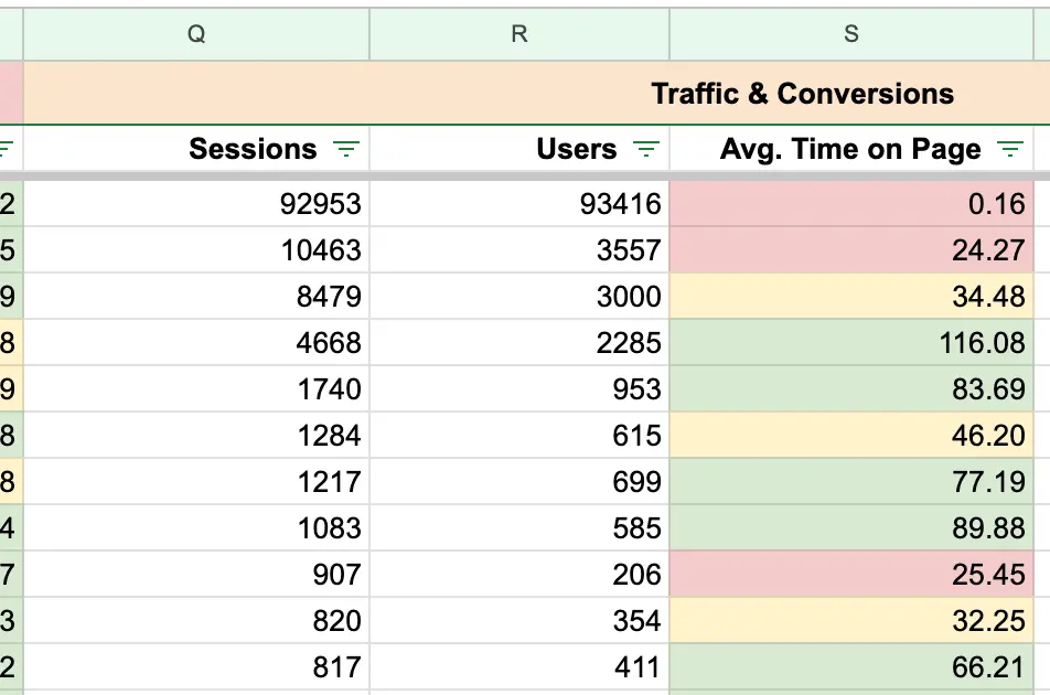 平均ページ滞在時間をRAGシステムで色分けしたデータのスプレッドシートの例を次に示しておく(データはダミーだ)。