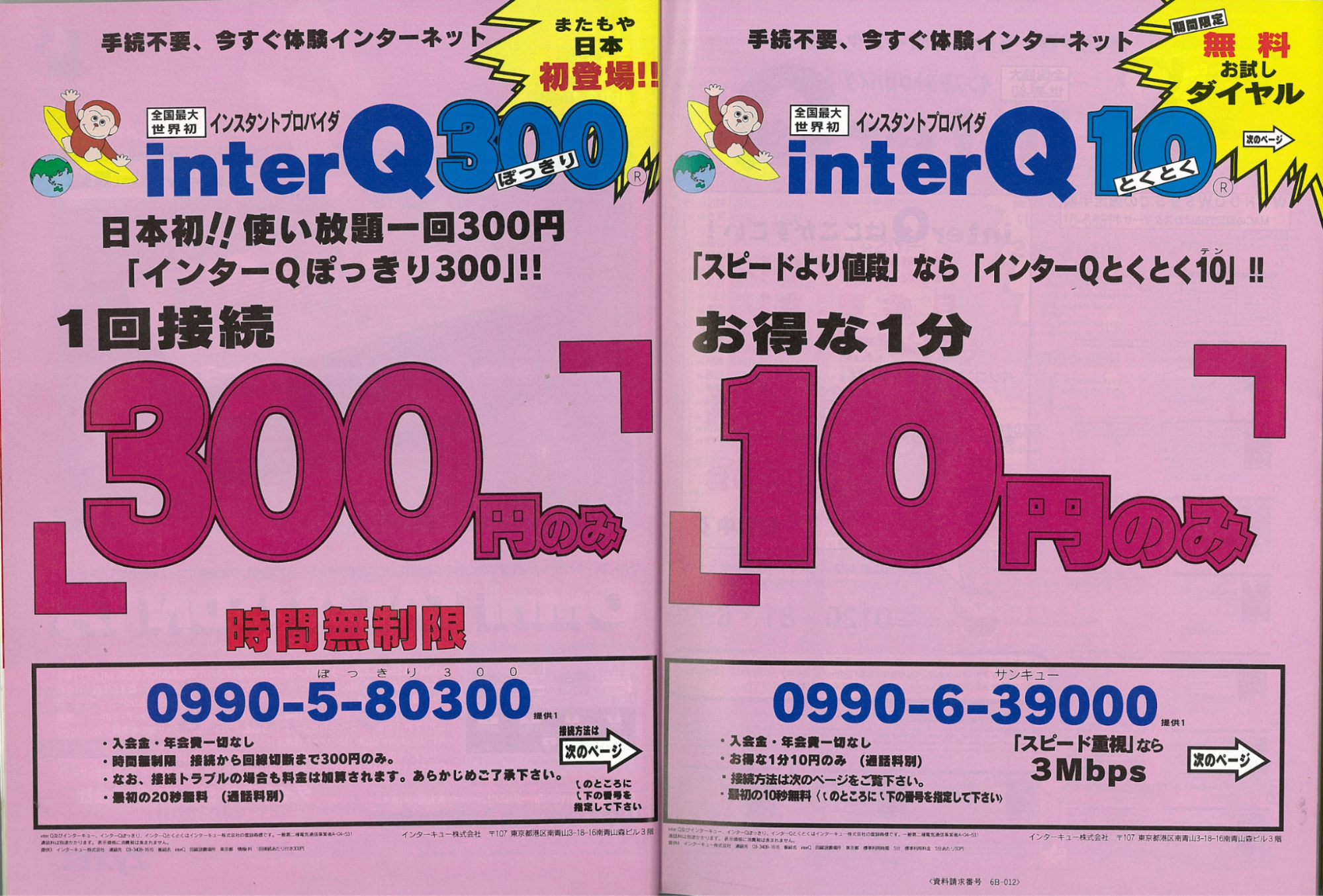 1995年11月末、Windows 95の発売に合わせて、ダイヤルQ²を利用したインターネット接続サービス「インターキュー」の広告を『FLASH』と『スコラ』という雑誌に掲載しました。時代は少し後になりますが、下図は1996年11月号の『iNTERNET magazine』に掲載された「インターキュー」の広告です。