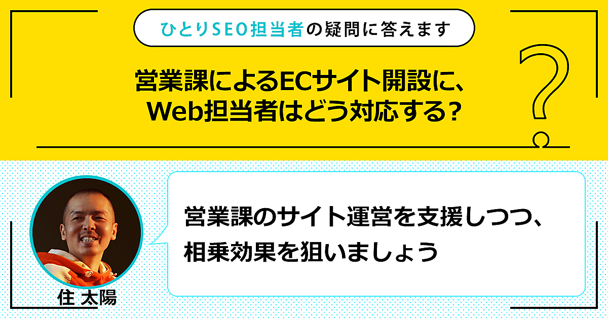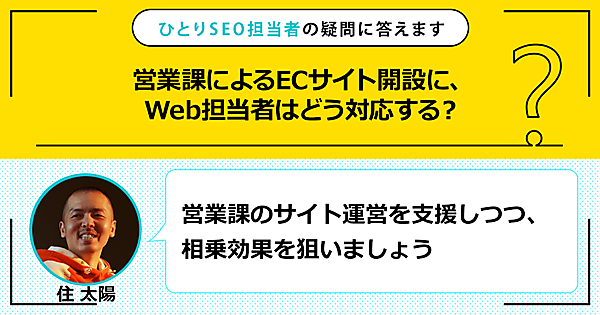 ひとりで頑張るSEO担当者さんの悩みに答える本連載。今回の質問は「営業課によるECサイト開設に、Web担当者はどう対応する?」です。この回答は「営業課のサイト運営を支援しつつ、相乗効果を狙いましょう」です。