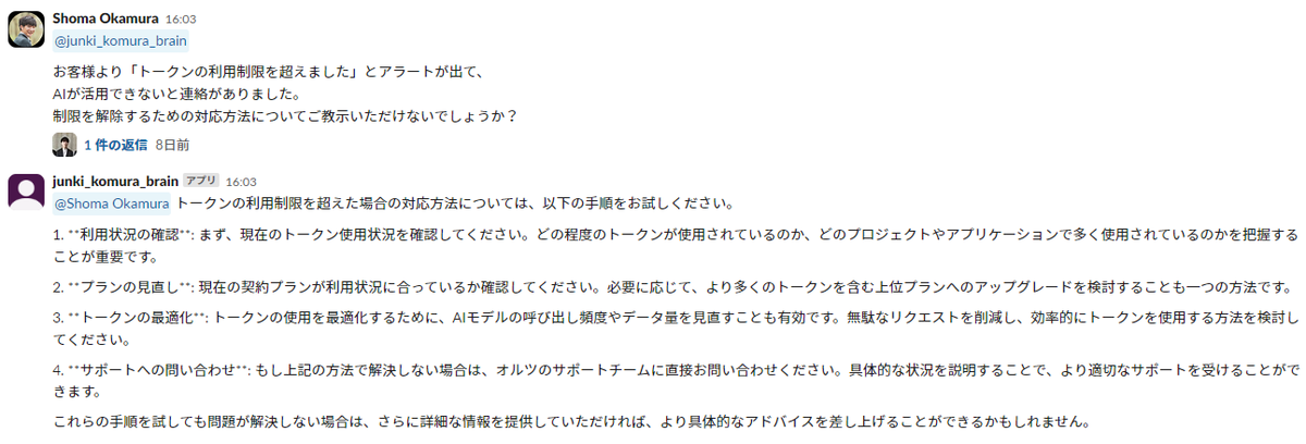 また、AIには“配慮する”ことが難しく、調整しない限り、学びをそのままアウトプットします。例えば、過去に『オルツのメンバーを紹介してください』とリクエストしたときに、退職したメンバーの説明をしたことがありました。当社で使っているSlackで、該当メンバーが自己紹介をしており、AIはその内容を学習していたためです(小村氏)