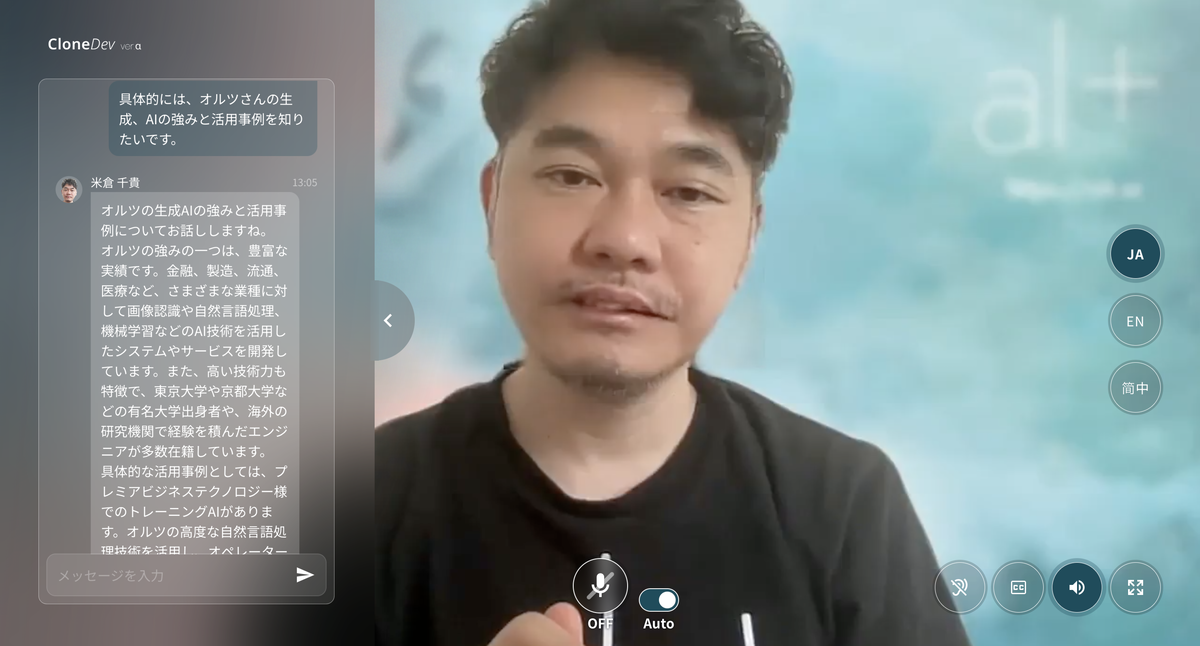 「質問をどうぞ」という投げかけに対して発話すると、マイク機能が音声を認識し、相手が答えを返してくれる仕様だ。米倉氏との対話では、オルツのビジョンや採用、技術の強みや具体事例に関する質問を投げかけてみたところ、回答はわかりやすく簡潔にまとまっていた。音声は文章の合間に間が入ったり、イントネーションが若干不自然だったりするものの、問題なく聞き取れる精度だった。