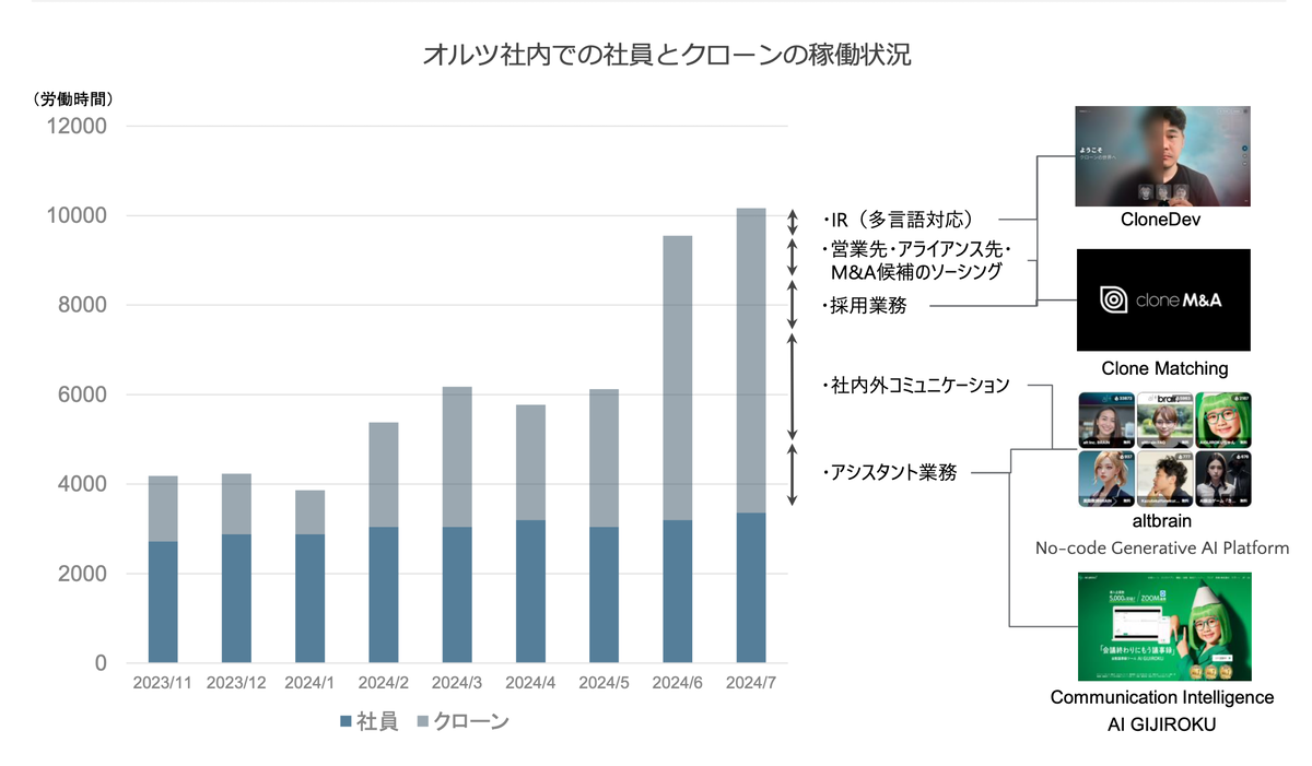オルツでは2023年10月からAIクローンとの協働を開始。徐々にAIに代替する業務が増えていき、2024年6月以降は人間よりもAIの総労働時間が上回るようになった。2023年12月からは、AIの稼働状況に応じて各社員に給料を追加支給する世界初の取り組み(同社調べ)も始めている。