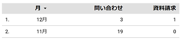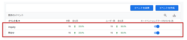 キーイベントが複数ある場合も同様の方法で登録することで一覧表として表示できます。下記の図は「問い合わせ」と「資料請求」という複数のキーイベントを登録した場合です。