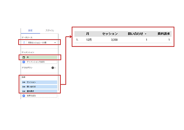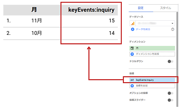 (4)統合データができたら、データソースに作成した統合データが選択されているのを確認して、ディメンションと指標を設定します。今回は月別で、セッションと2種類のキーイベント「問い合わせ」と「資料請求」を一覧できる表を作成しますので、ディメンションに「月」、指標に「セッション」「問い合わせ」「資料請求」を選択します。これで追加設定をすることなく、各月別のセッションと日本語のキーイベント数が確認できます。