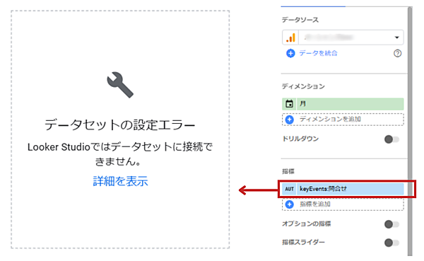 しかし、指標を「keyEvents:問合せ」を選択するとデータセットの設定エラーの表示が出て月別のキーイベントをLooker Studioで確認できません。このようにイベント名を日本語で登録するとエラーになるので、イベント名は英語表記を推奨します。