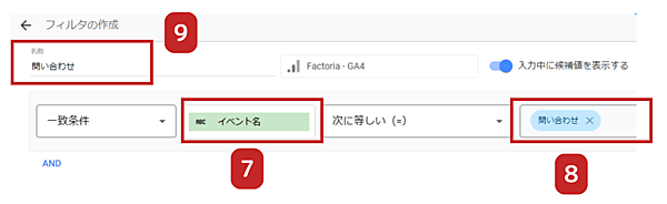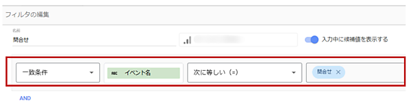 フィルタは「一致条件」で「イベント名」を選択し、演算子は「次に等しい(=)」から任意のキーイベントを選択します。今回は「問い合わせ」を選択します。フィルタの名前としてキーイベント名と同じ「問い合わせ」を入力して保存しておきましょう。