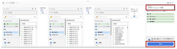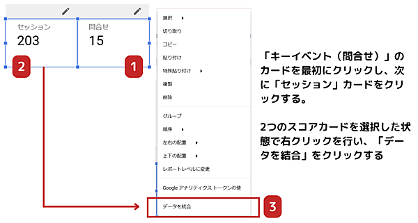 (3)また、コンバージョン率を計算したい場合は、セッションとキーイベントの2つのスコアカードを選択し、「データを結合」で作成できます。
