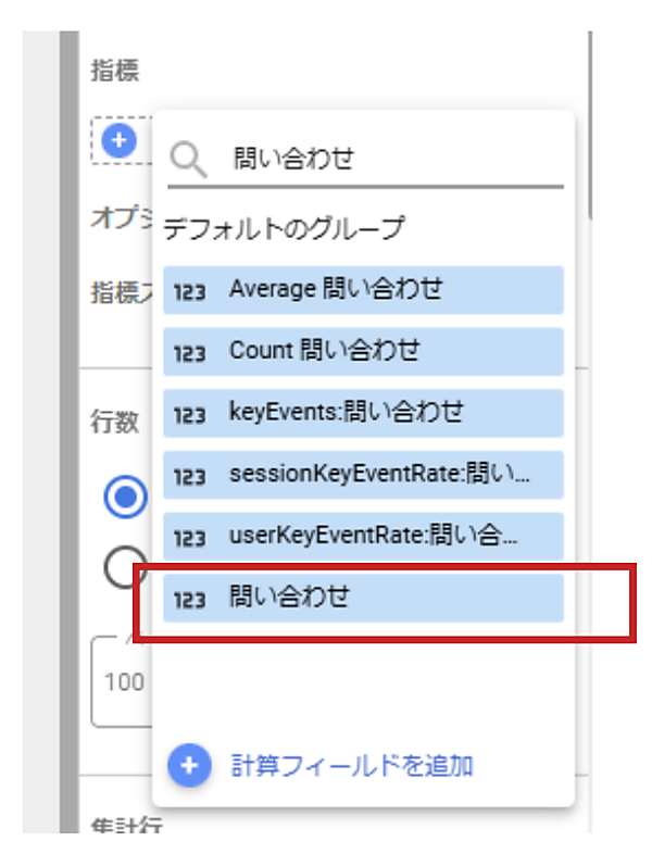 (2)Looker Studioの「グラフを追加」から指標を確認するとカスタム指標で設定したキーイベント名が表示されます。今回は「問い合わせ」という名前でカスタム指標を登録したため、「問い合わせ」という指標名が表示されています。