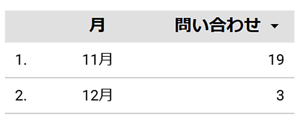 (3)ディメンションに「月」、指標に「問い合わせ」を設定することで、日本語名のキーイベント「問合せ」が表に表示されます。なお「KeyEvents:問い合わせ」(日本語のキーイベント)を選択するとデータセットの設定エラーの表示が出ますのでご注意ください。