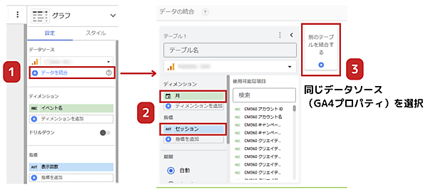 (1)Looker Studioの「グラフを追加」からデータソースの「データを統合」をクリックし、テーブル1を作成します。今回は月別で指標にセッションと2種類のキーイベント「問い合わせ」と「資料請求」を一覧できる表を作成しますので、テーブル1のディメンションは「月」、指標は「セッション」を選びましょう。次に「別のテーブルを結合する」をクリックして、同じデータソース(GA4プロパティ)を選択します。