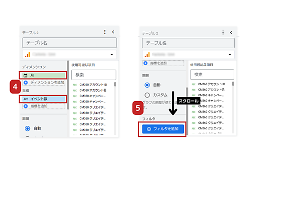 (2)次にテーブル2を作成します。ディメンションに「月」、指標に「イベント数」を選択し、下へスクロールをして、「フィルタを追加」をクリックして、フィルタを作成します。