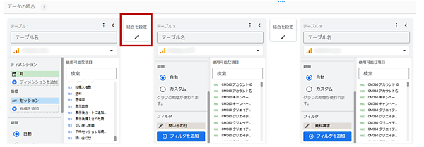 同じ方法で「資料請求」も登録して、テーブルを3つ作成して、「結合を設定」ボタンをクリックします。