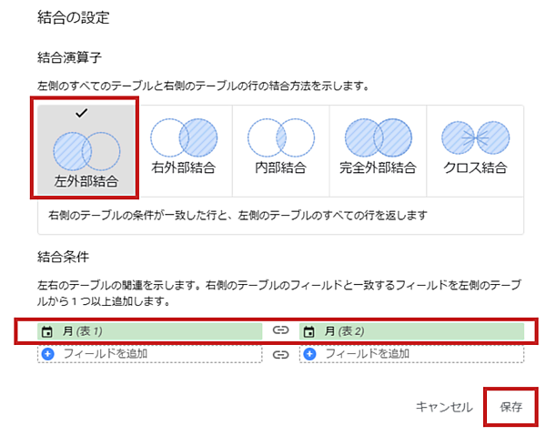 結合の設定では、結合演算子として「左外部結合」を選択し、結合条件として、各表のディメンション「月」を選択して、保存をクリックします。