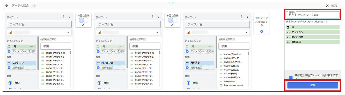 (4)結合の設定の登録が完了したら、統合名に任意の名称をつけて、右下の「保存」ボタンをクリックして統合データの作成は完了です。