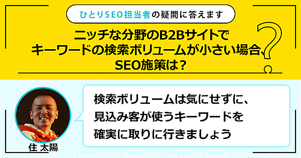ひとりで頑張るSEO担当者さんの悩みに答える本連載。今回の質問は「ニッチな分野のB2Bサイトでキーワードの検索ボリュームが小さい場合、SEO施策は?」です。この回答は「検索ボリュームは気にせずに、見込み客が使うキーワードを確実に取りに行きましょう」です。