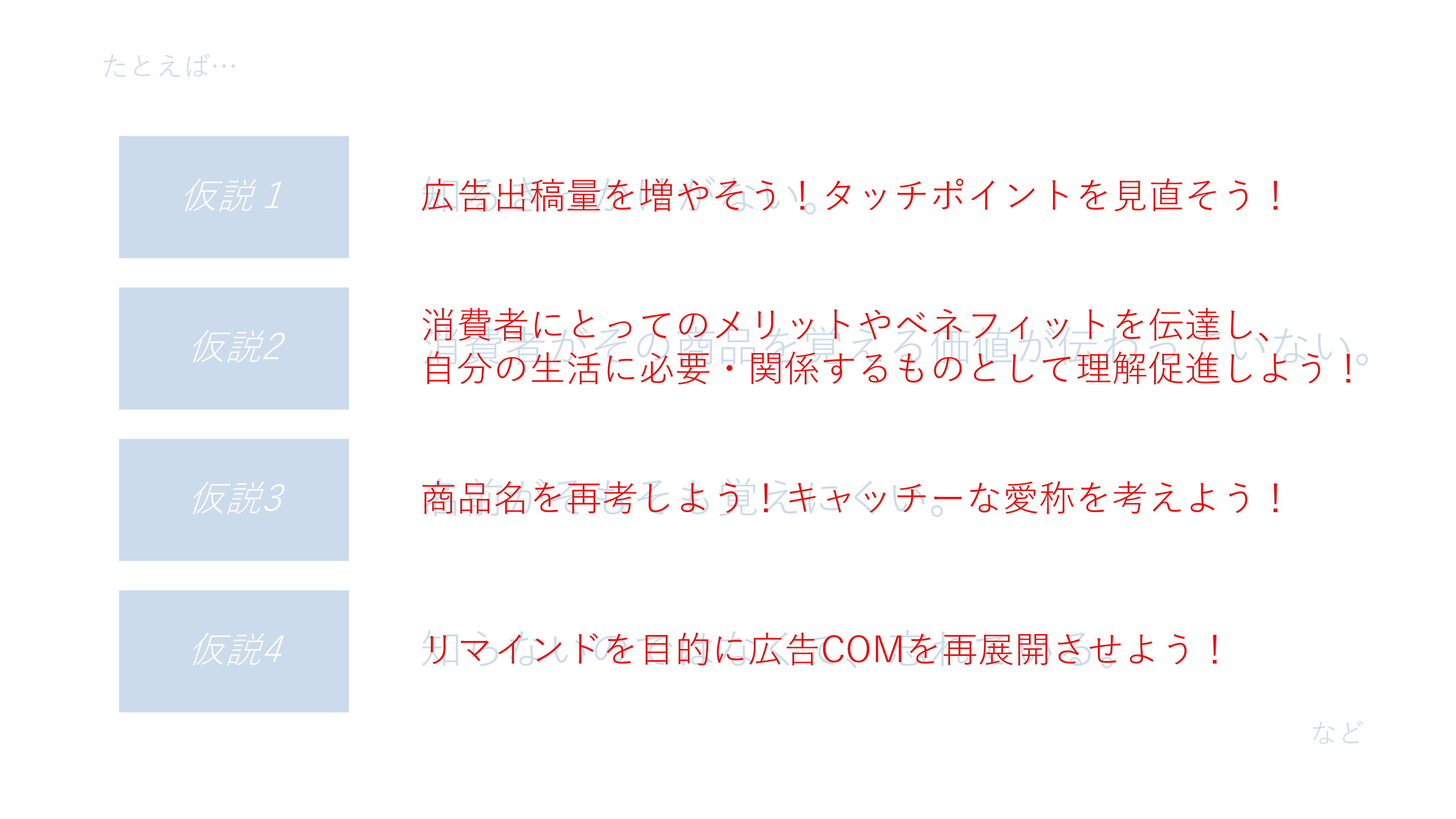 こうした課題がみえてくると、次図のように、やるべきことも見えてくる。たとえば、仮説1の「知るきっかけがない」という課題に対しては、「広告出稿量を増やそう」「タッチポイントを見直そう」という、やるべきことがみえてくるわけだ。