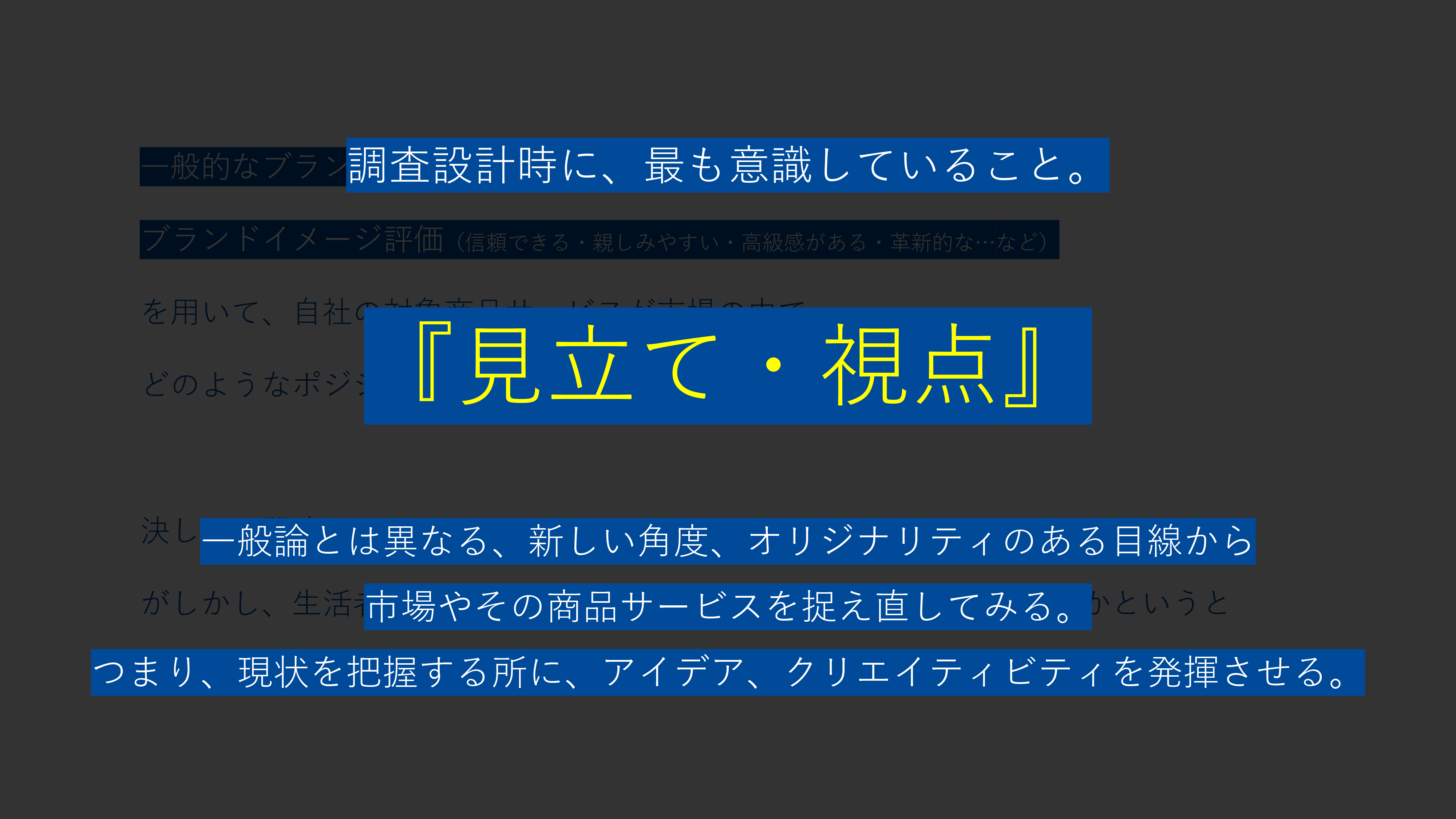 これに対し、飯野氏は「決して間違ってはいないものの、生活者の本音・リアリティのある認識なのかというと、これだけではまだ解像度が低い」と指摘する。そのため、調査設計時に最も意識していることが「見立て・視点」だという。