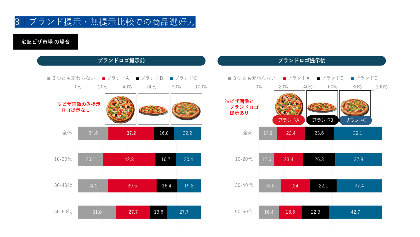 この結果から、ブランドAはロゴの提示前は他ブランドに比べて優位だったにもかかわらず、ロゴを提示した状態で比較すると弱くなっていることがわかる。つまりブランド力が相対的に低いのだ。ブランドBでは逆の現象が起きていることも見て取れる。