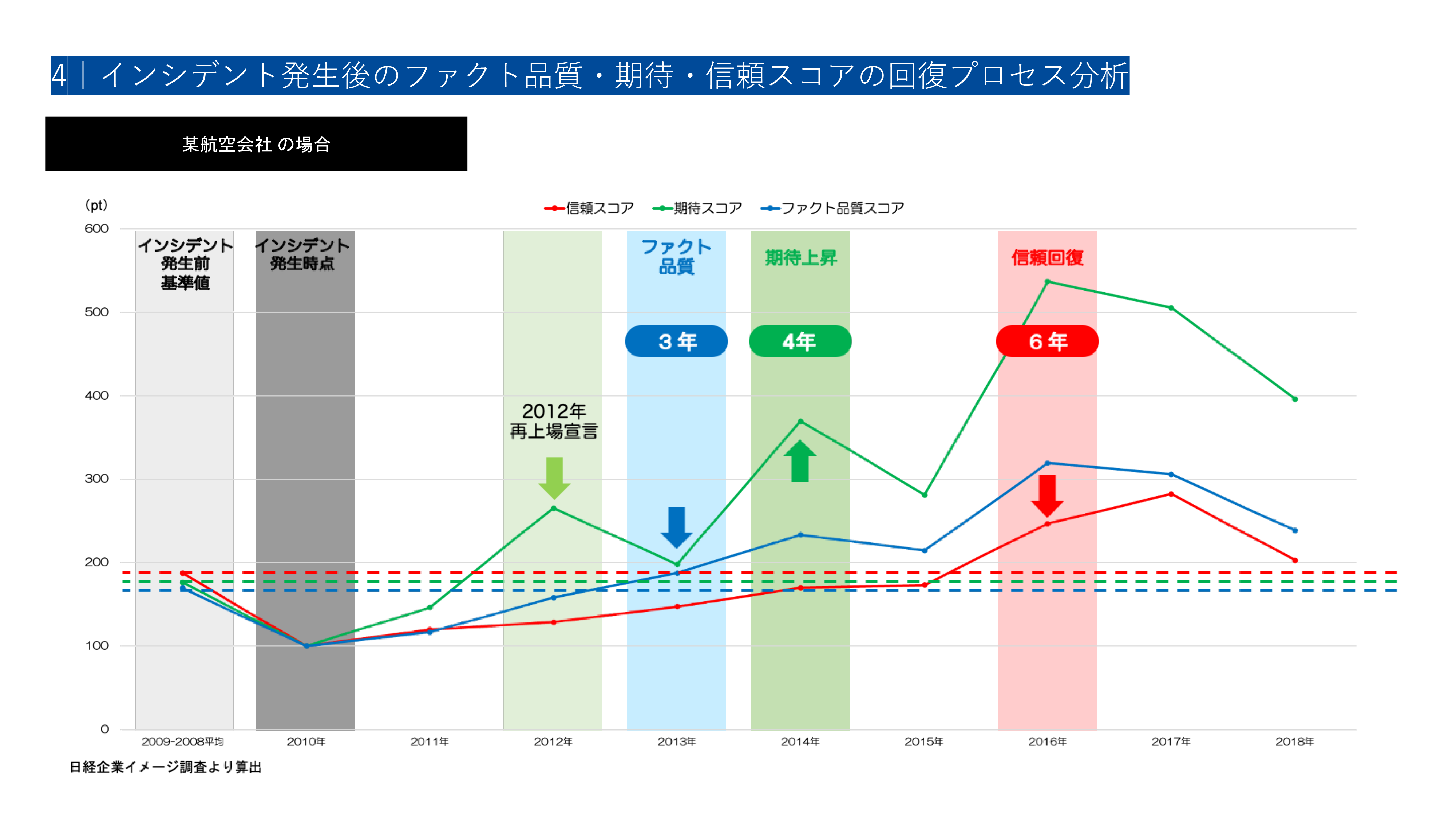 上図は航空会社を取り上げたグラフ例だが、「信頼」の前に「期待」が立ち上がり、その前に「ファクト品質」が回復していくことがわかる。しかもこの順番は、他業界での事例を分析した結果を見ても同様となる。