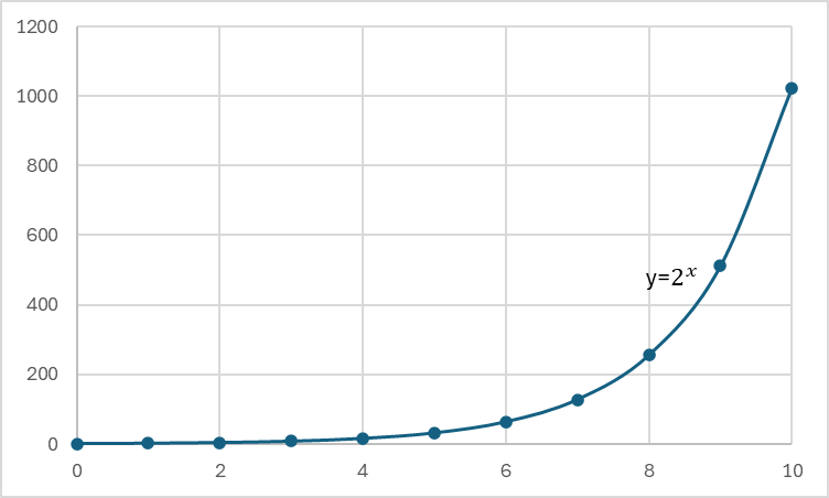 アユムさんのために2の累乗をグラフにしました。横軸(𝒳軸)が2をかけた個数、縦軸(𝒴軸)が求められた数値です。