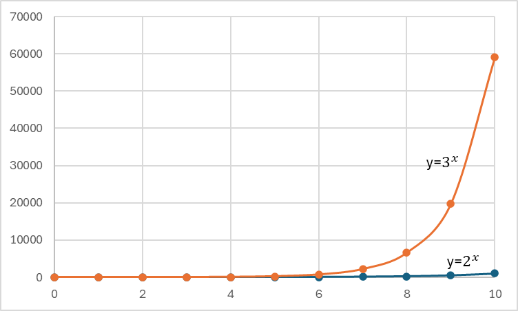 そうなんです。指数関数的とは、このようにある値(𝒳)にあわせて変化する量(𝒴)が大きく変化する状態をあらわします。等比級数的、加速度的などとも言いますね。ちなみに、このグラフは 𝒴=a𝒳 (a>1)なので𝒳が増えると𝒴の値も一気に増えていきますが、𝒳が減ると𝒴の値は 指数関数的に減っていきます。