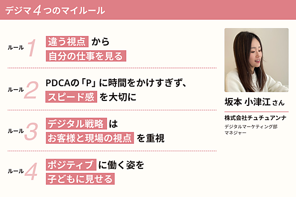マーケティング部に異動したときには幼かった坂本氏の子どもたちは、現在小学校3年生と1年生になった。ワーキングマザーとして働く中で、坂本氏には大事にしていることがある。