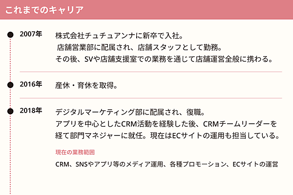 復帰前に上司と電話で話したときに、『店舗のお客様をよく知っている店舗経験のあるあなたに、CRMを任せたい』と言われました。私はCRMという言葉を聞いたのが初めてだったくらい、マーケティングの知識がない状態でした。復帰してみると、ユーザーシナリオ、カスタマージャーニーなど未知の言葉が飛び交っていて、異世界に来たような感覚になりました(坂本氏)