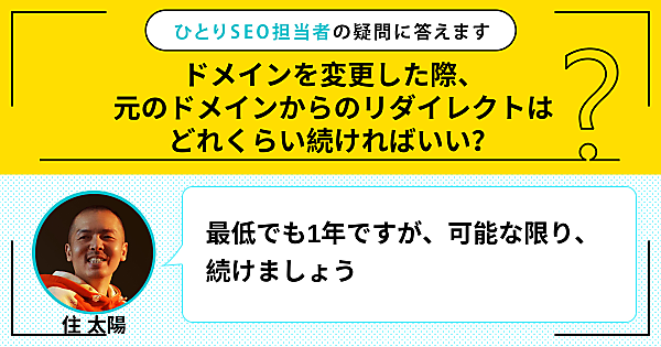 ひとりで頑張るSEO担当者さんの悩みに答える本連載。今回の質問は「ドメインを変更した際、元のドメインからのリダイレクトはどれくらい続ければいい?」です。この回答は「最低でも1年ですが、可能な限り、続けましょう」です。