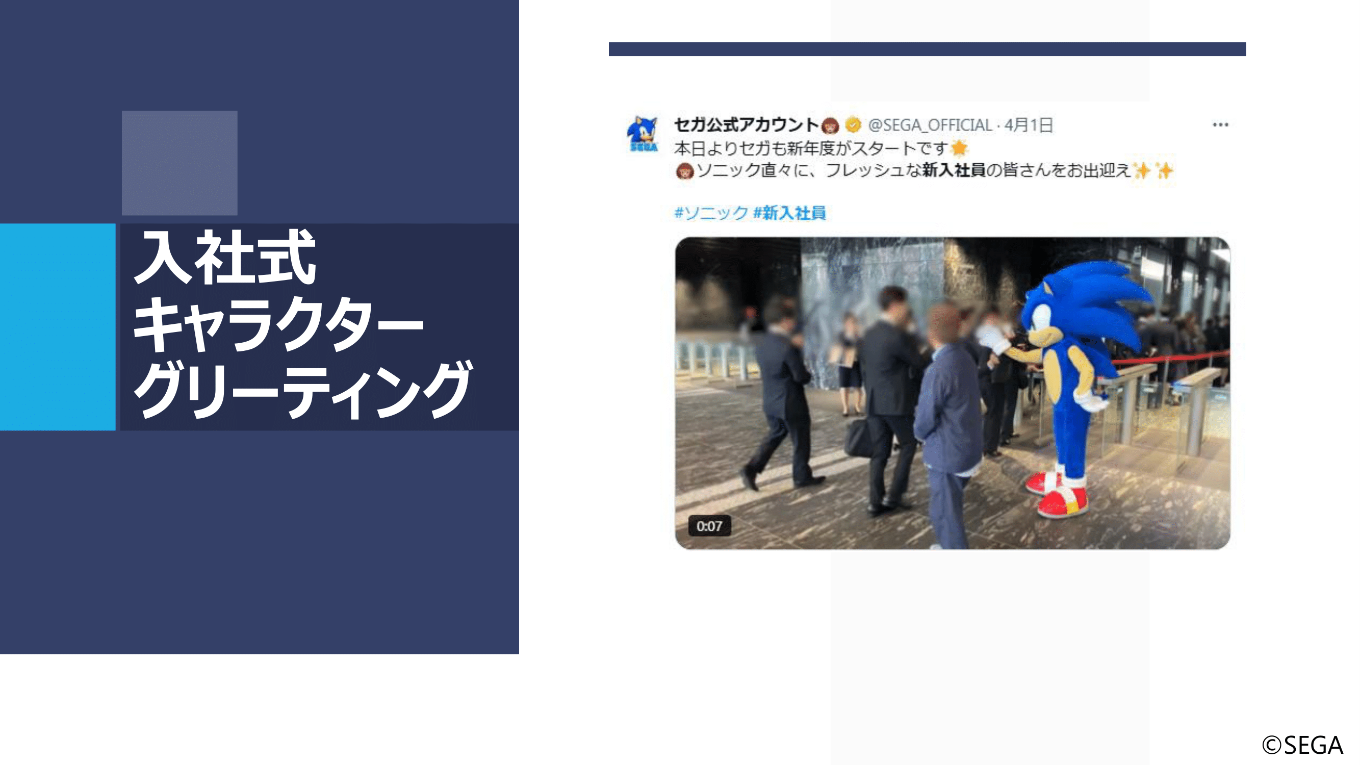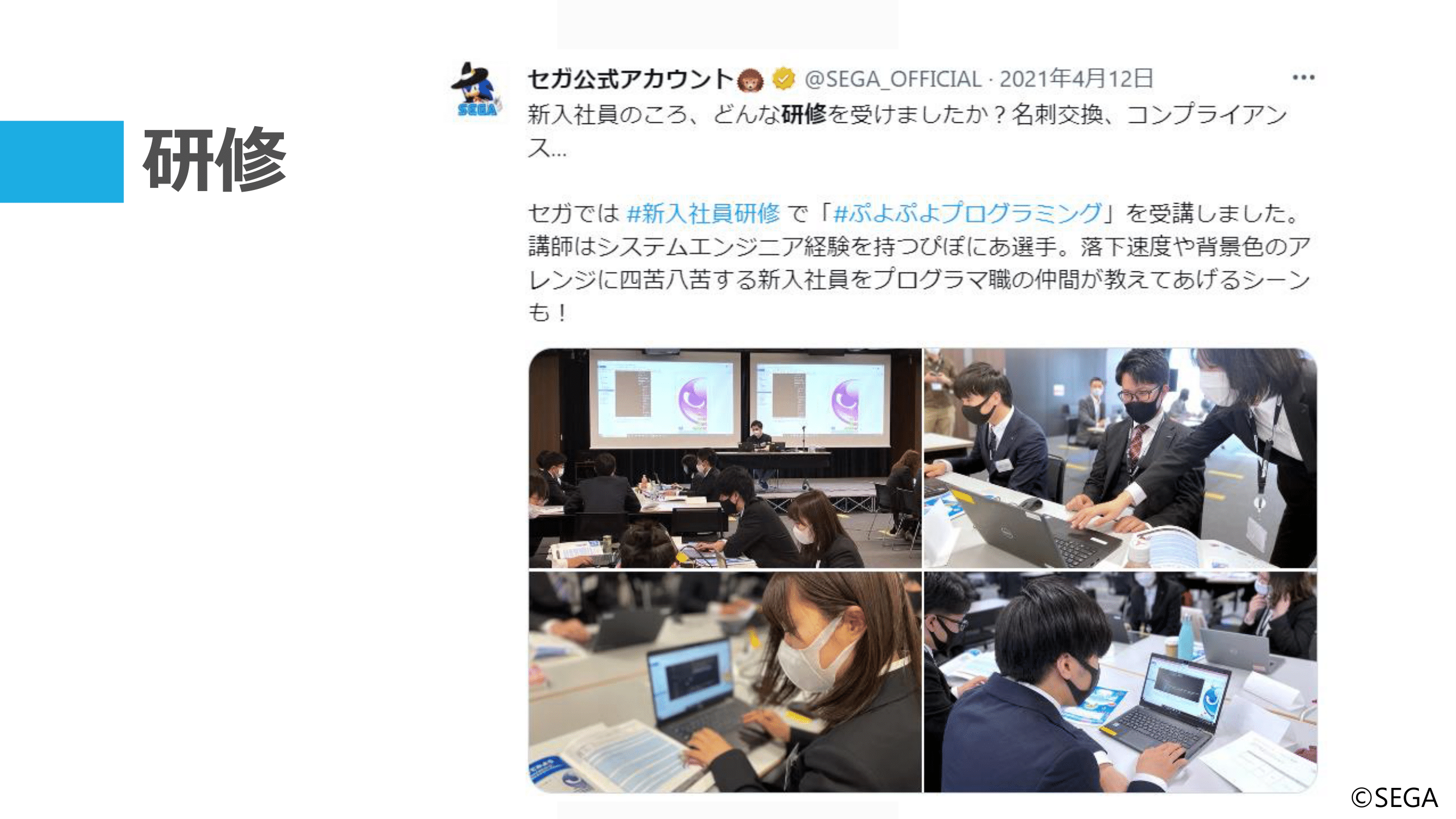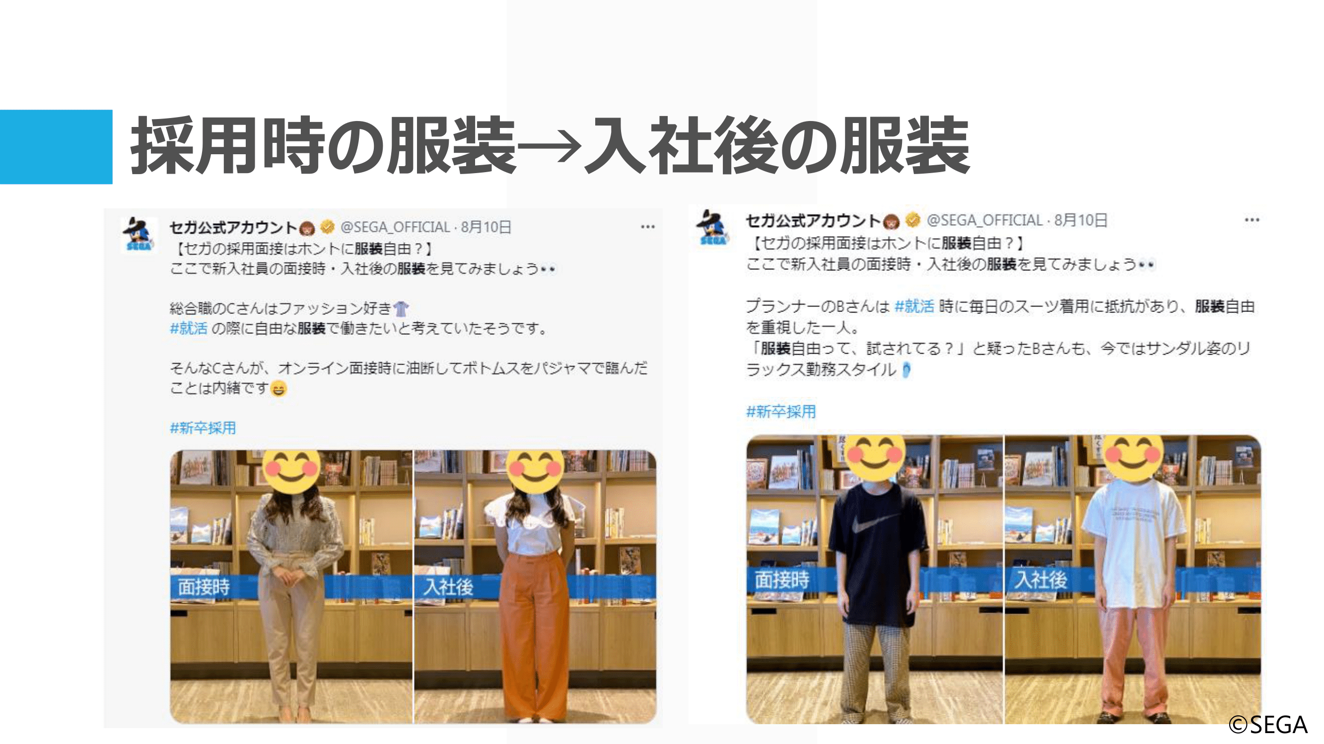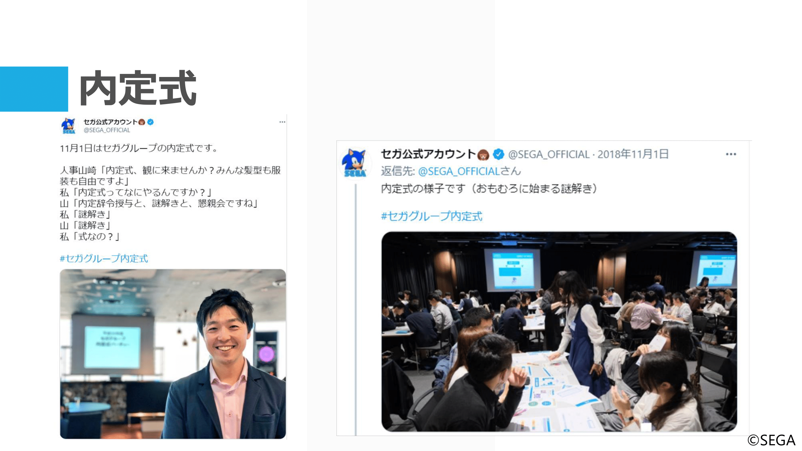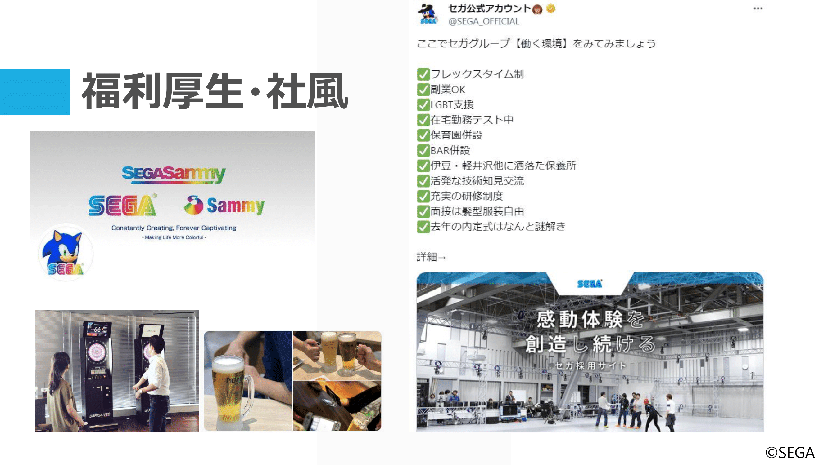 まず、働く環境や福利厚生についての投稿だ。セガではフレックスタイム勤務、副業OK、LGBT支援あり、面接時の髪型や服装は自由。昨年の内定式で“謎解き”を実施したことも紹介された。
