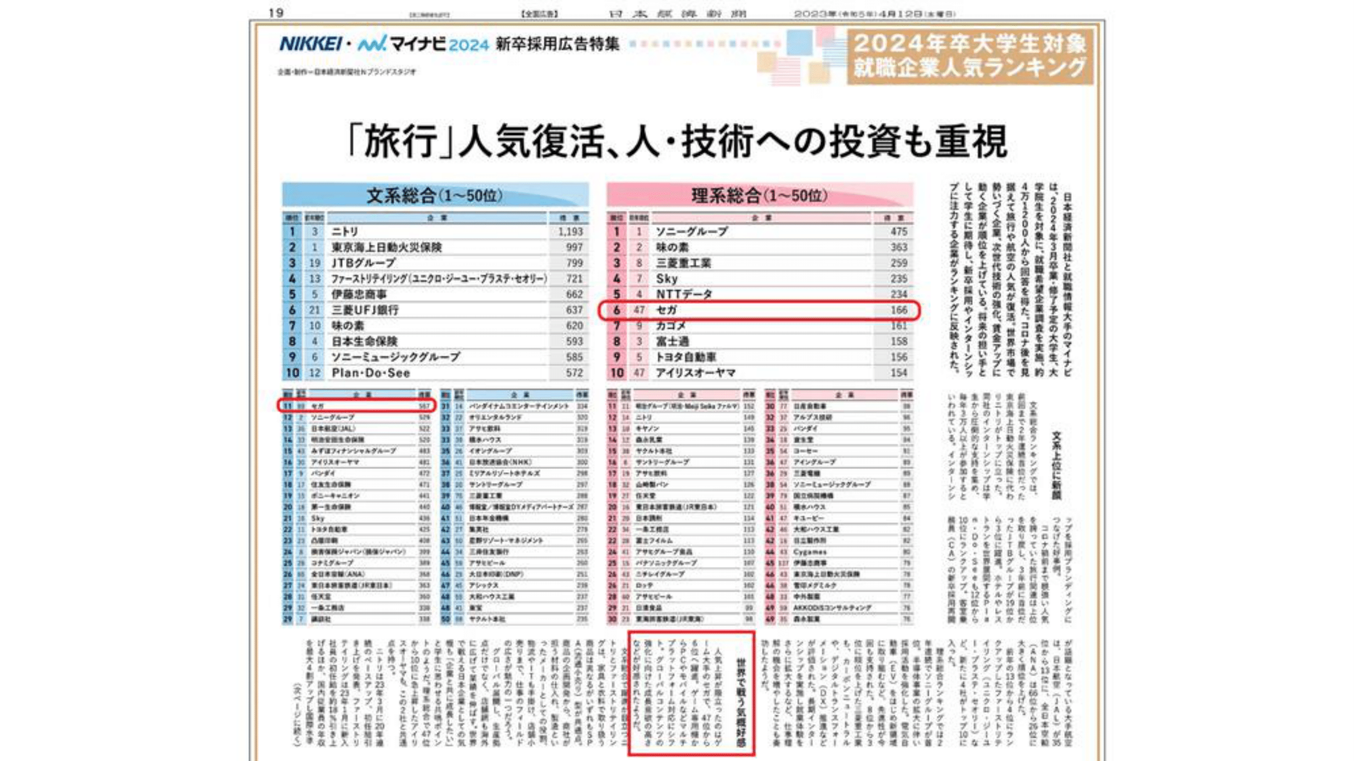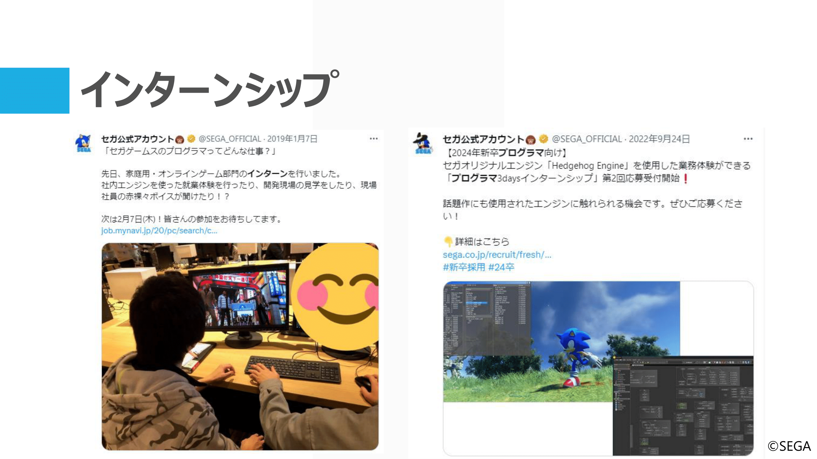 セガは2024年卒大学生対象の「就職企業人気ランキング」(マイナビ、日本経済新聞社の共同調査)において、文系総合で11位、理系総合で6位を獲得した。山田氏は「もちろんこれはSNSだけの成果ではありません。人事部を中心に、採用説明会などを丁寧に行った結果です」と語る。