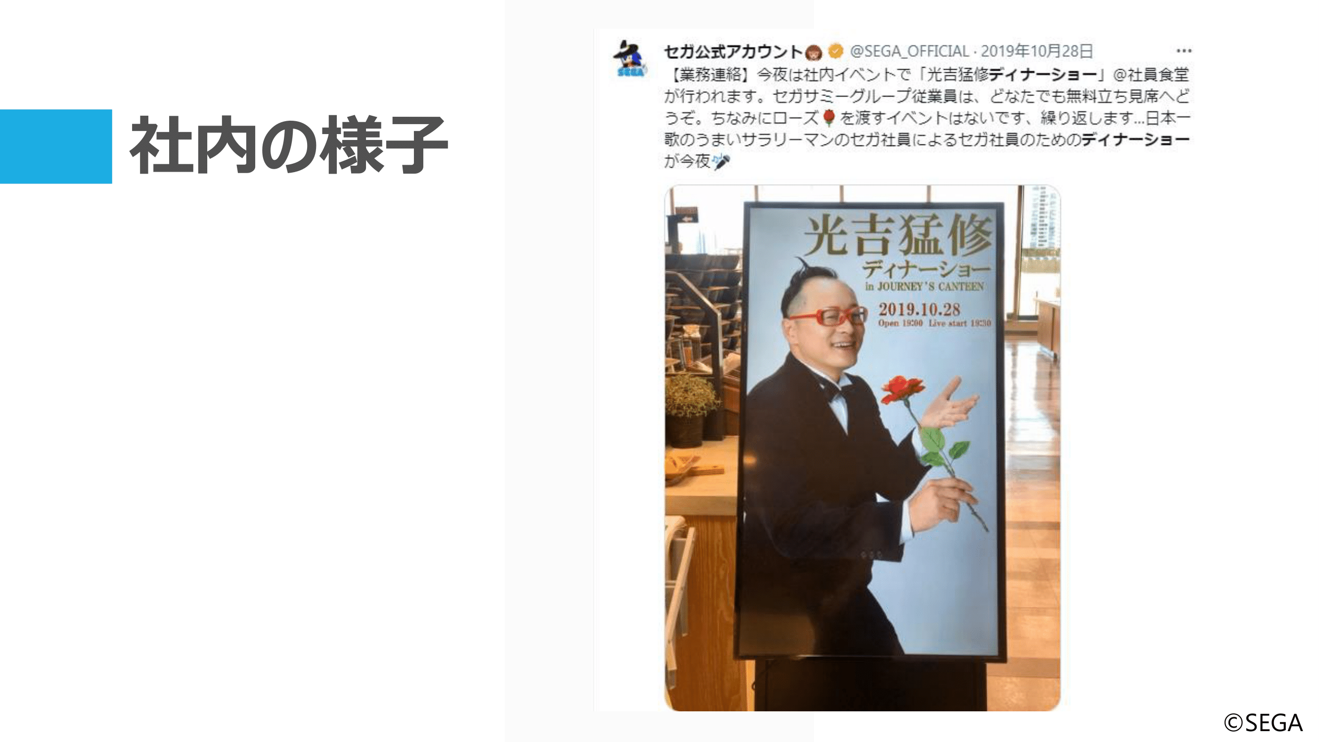 “セガ社員のセガ社員によるセガ社員のためのディナーショー”と銘打って開催し、動画を撮ってXで発信しました。業界他社のサウンドクリエイターの方からは「今から転職していいですか?」という嬉しい反応もありました(笑)(山田氏)