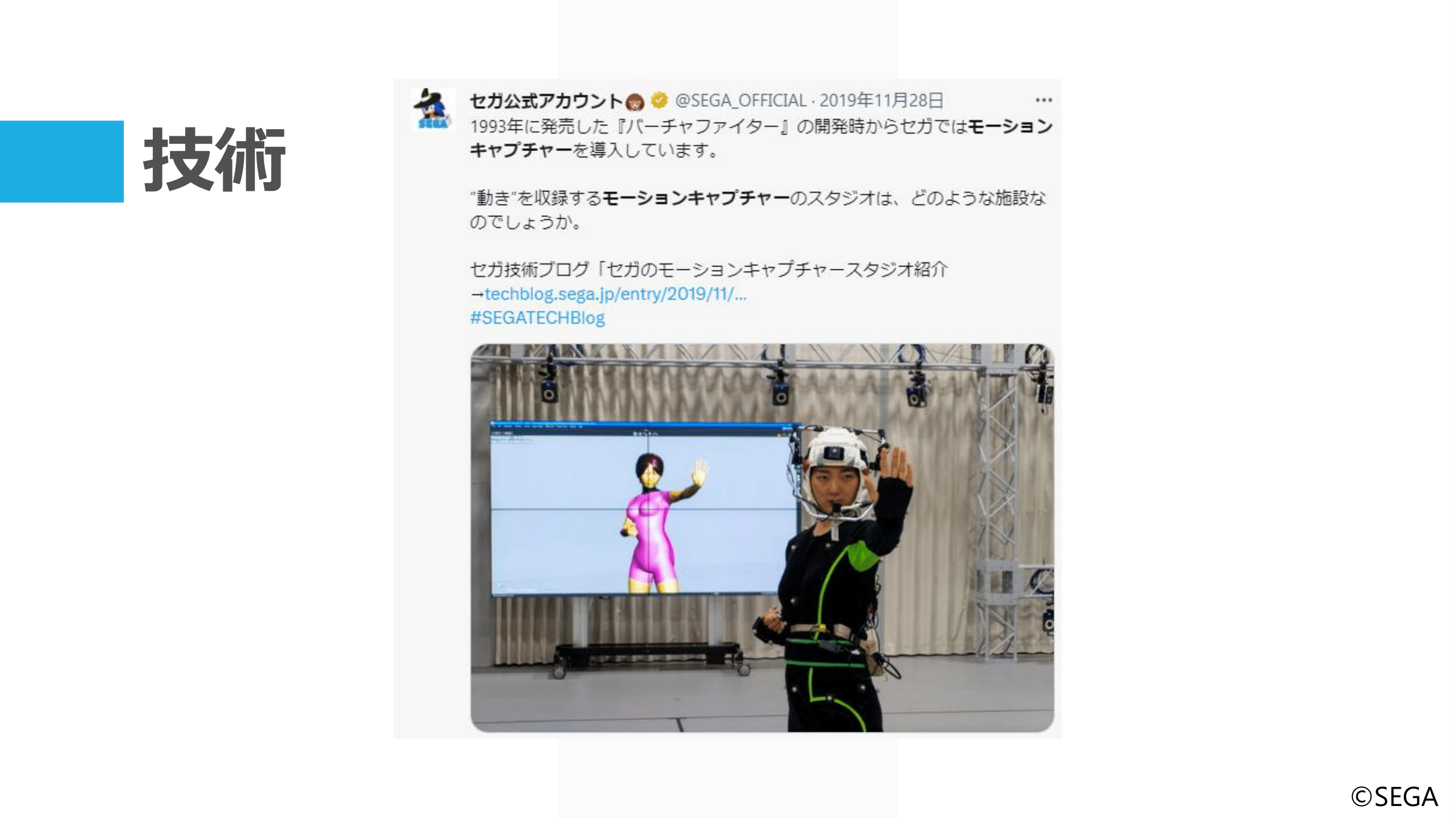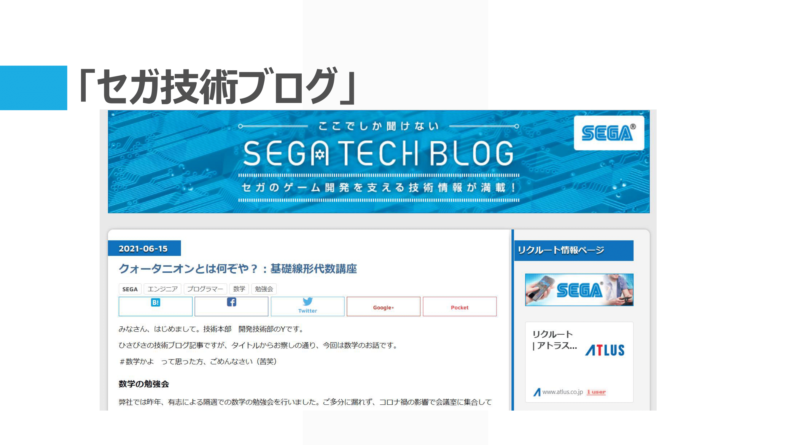 「SEGA TECH Blog(セガ技術ブログ)」とは、ゲーム開発に関わる専門知識を解説するWebサイトのことだ。「技術のセガ」というプレゼンスを向上させることを目的に、社内開発者自ら記事を執筆している。外部から優秀な人材を呼び込むリクルートの役割もあるという。