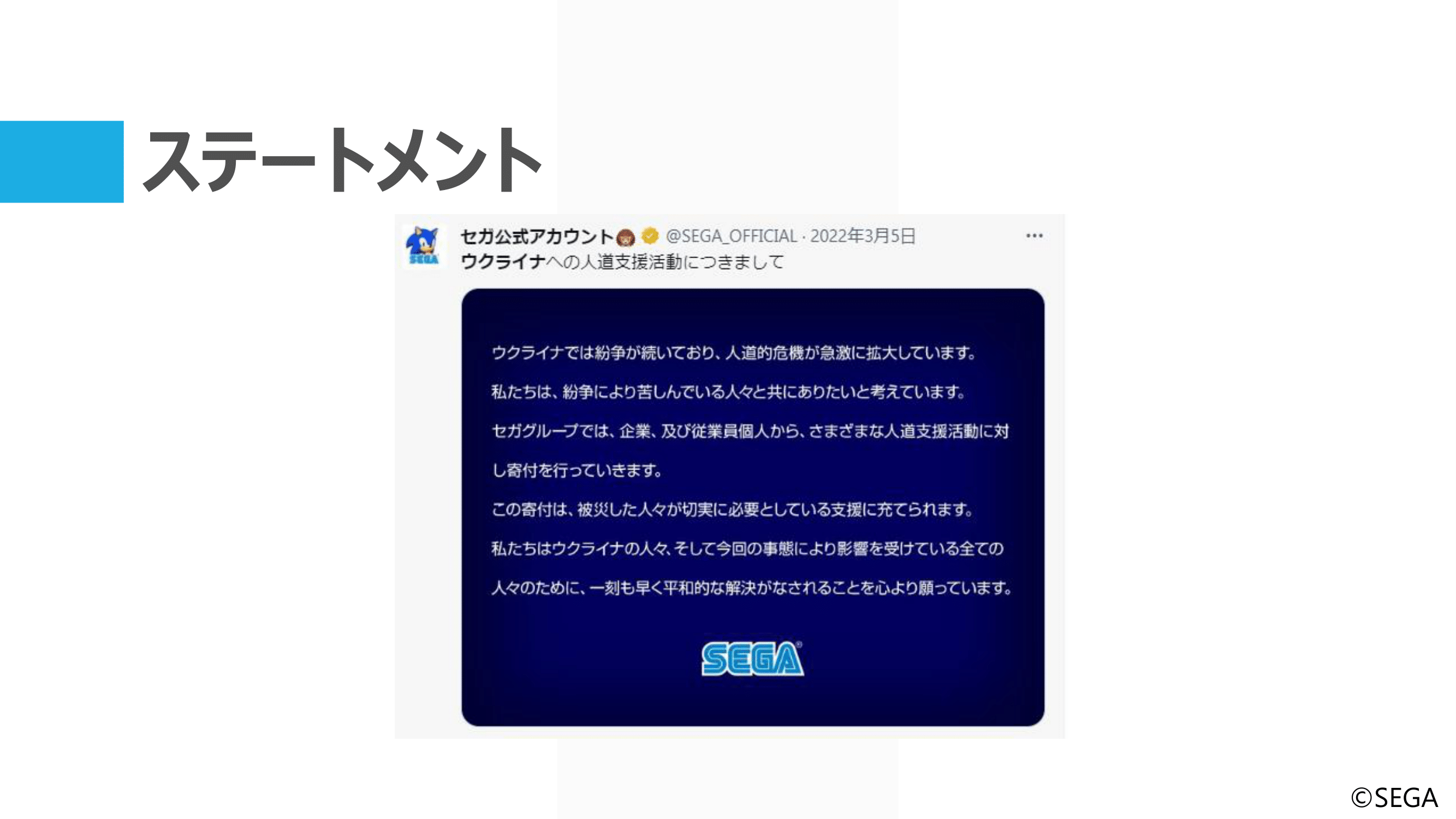一方で、ウクライナでの紛争に際しては、発生から間もない段階で、人道支援に対する寄附についてのステートメントを出している。