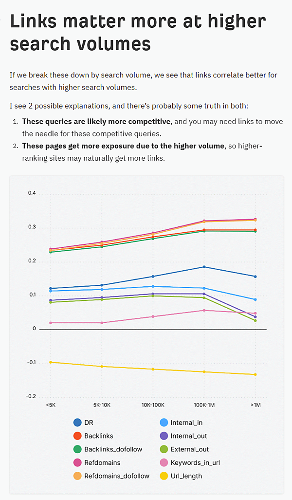 これは、競争の激しい検索環境では、より強力なリンクプロファイルが必要となるためだと考えられる。ただし、検索ボリュームの大きいキーワードでは「上位表示されたページが自然と多くのリンクを獲得する傾向にある」ことも、この相関の強まりに影響している可能性がある。