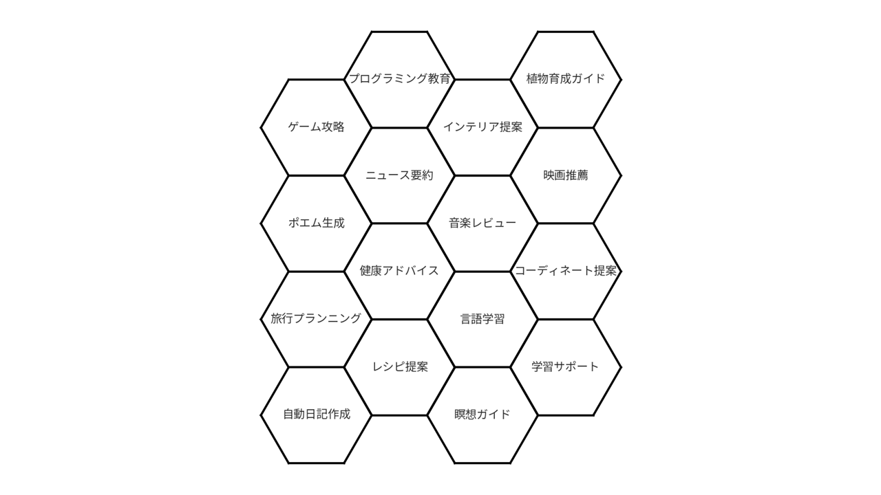 【作成した4行4列のハニカム構造の上に、ChatGPTの面白い活用法を発想し、ハニカム内に表示して。matplotlibとこの日本語フォントを使って】