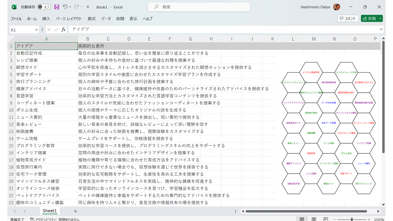 と入力すると表にしてくれるので、その表と図をExcelにまとめたのが以下のファイル。書籍や講演のアイデア出しに使えそうだ。人間が1時間くらいかけてブレストして作ったようなアイデアとカテゴリ分けが、10分くらいでできる。