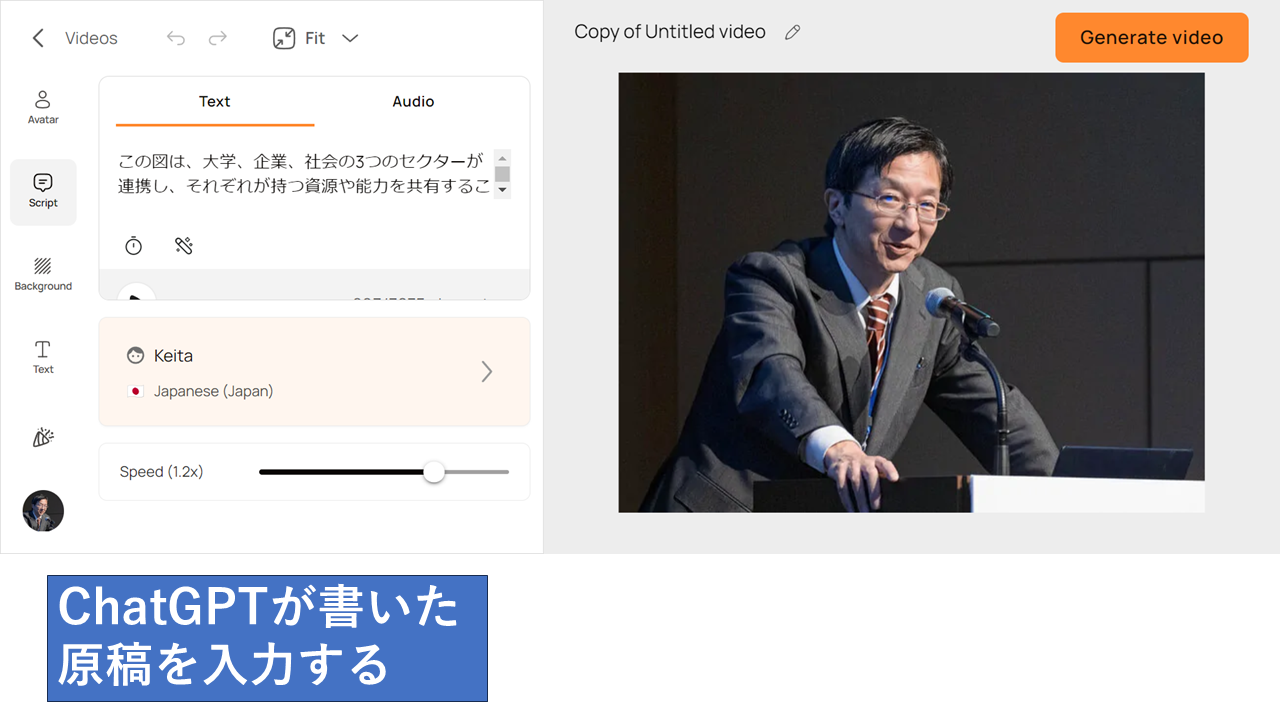 さらにセッションでは、テキストの音声化AIや、その音声に合わせて画像を動かすAIを組み合わせて、橋本氏が話しているようなAI動画のデモも紹介された。