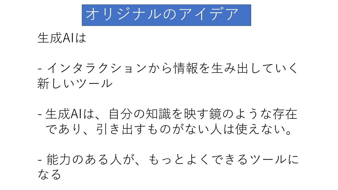 生成AIは、アイデアを発展させる、考えるパートナーとしての使い方をすると、生産性に直結する(橋本氏)