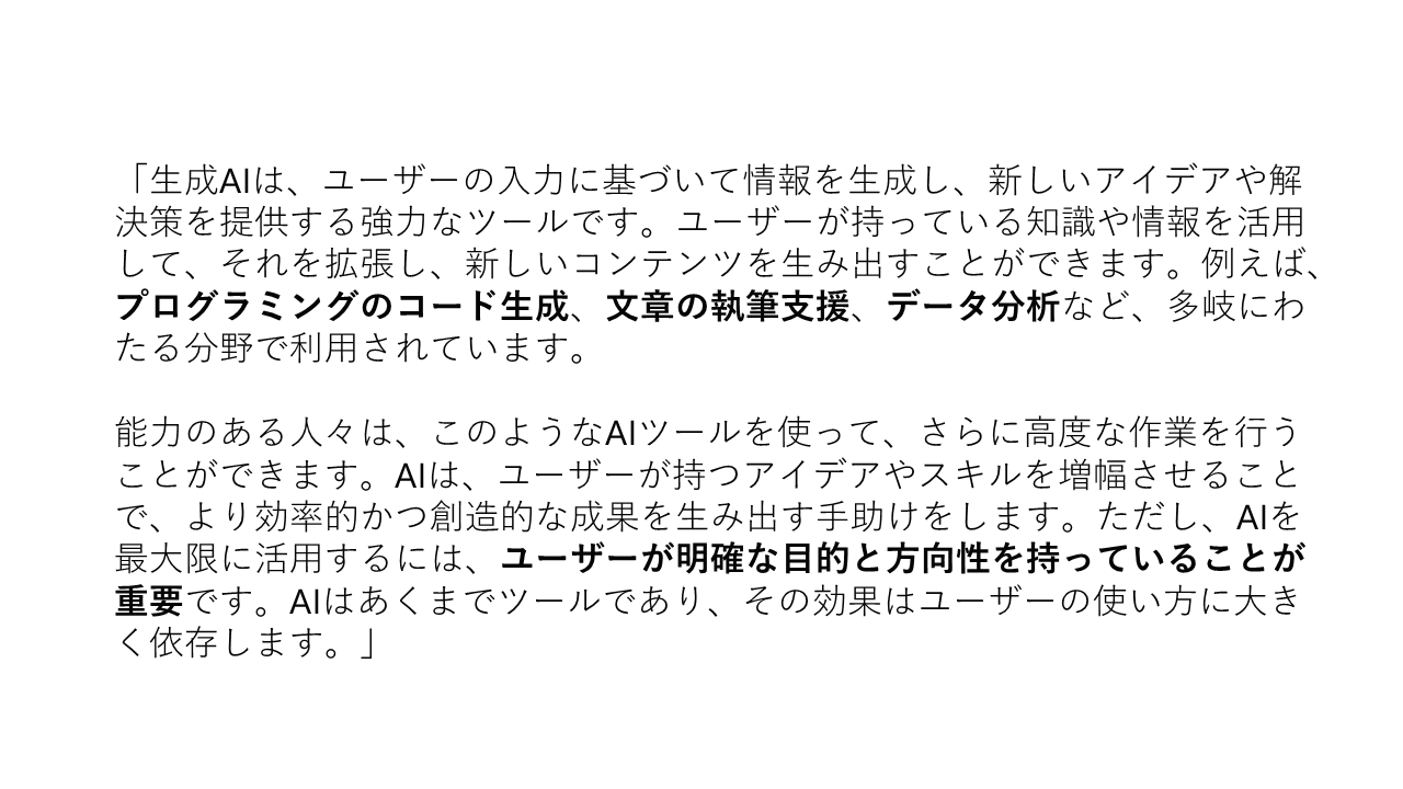 また、橋本氏のオリジナルのアイデアには、「能力がある人が使える」というニュアンスが含まれている。それをChatGPTでは、ポジティブな言い回しに変えてある(2段落目の太字部分)。一般向けの書籍では、ChatGPTが生成した表現の方が妥当だろう。このように、ChatGPTは、ネガポジ変換が得意であり、ポリティカルコレクトネスに配慮した文章に直すようなこともしてくれる。