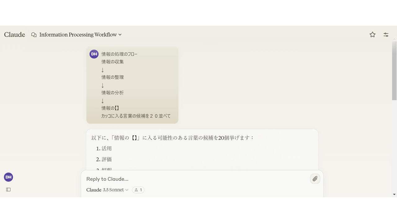 ここで、ChatGPT以外のエンジンについても紹介する。「Claude(クロード)」という生成AIは、ChatGPTよりも創造的な生成が得意で、日本語能力が高い。橋本氏が思考法の本を書いている時に、情報処理のワークフローについて、「情報の収集、整理、分析、その次は何だろう」と発想に詰まった。発信か、活用か、何かもっといい言葉はないだろうか。