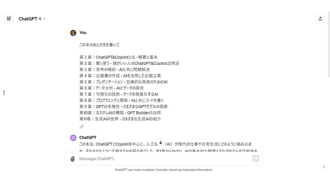 以下の図では、橋本氏の著書『頭がいい人のChatGPT & Copolotの使い方』の目次をChatGPTに入力して、あとがきを書かせている。