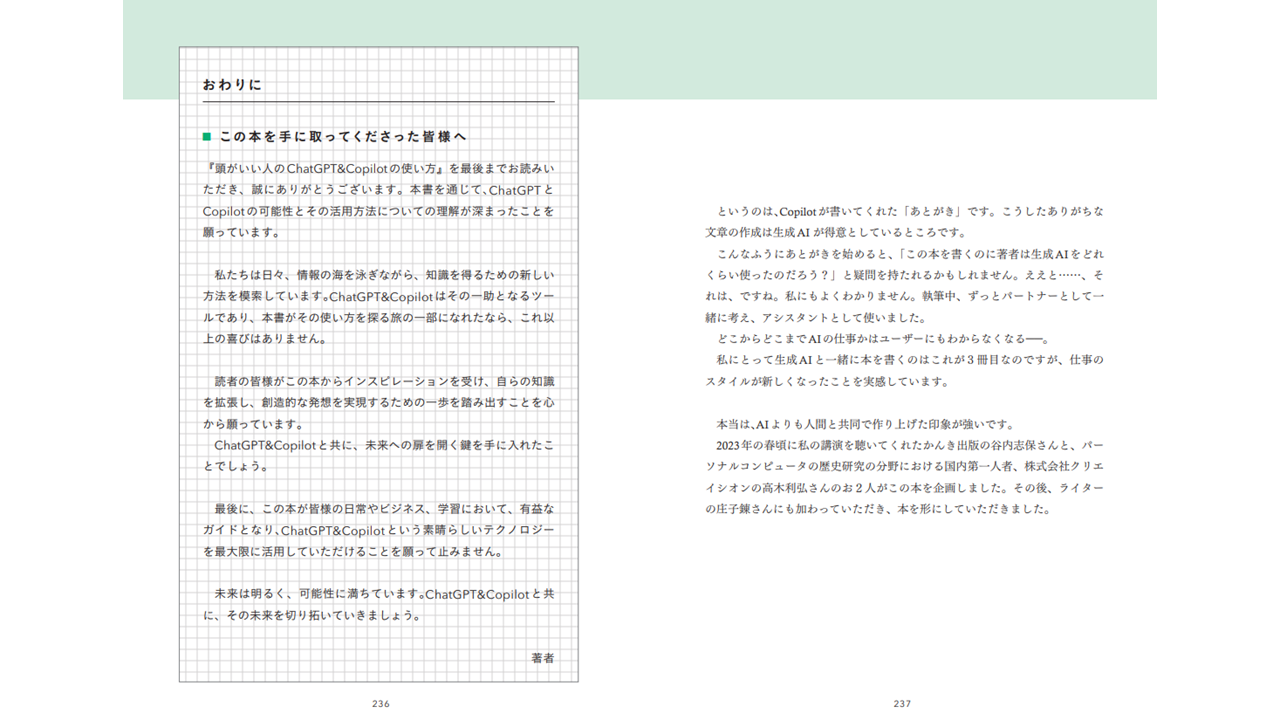目次を入れただけで、実にあとがきっぽい文章を書いてきたので、橋本氏は書籍にそのまま「あとがき」として掲載したという。ただし、見開き対向ページに「『あとがき』はChatGPTが書いてくれた」と言及し、自身が書いたあとがきも記載している。