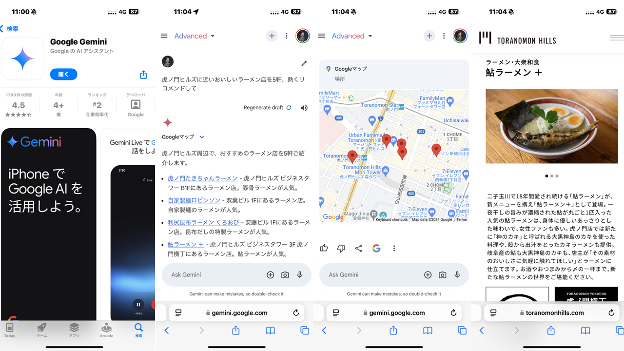 Geminiの特徴は、Googleの他サービスと密に連動している点だ。たとえば、【虎の門ヒルズに近いおいしいラーメン店をリコメンドして】と依頼すれば、店の情報と共にGoogleマップまで出る。