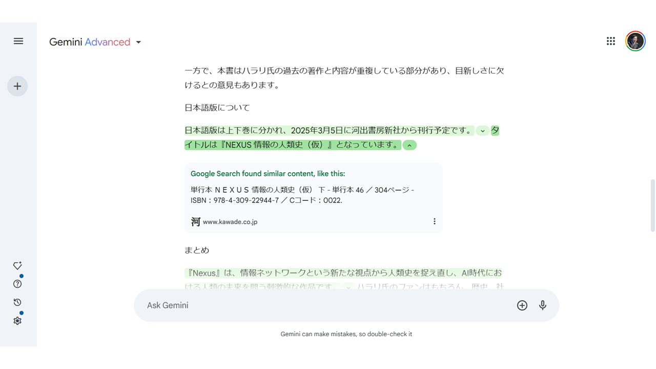 生成した文の最後にある「G」のアイコンがファクトチェックボタンで、クリックするとその文に合致する内容がWeb上にあるかGoogle検索で確認する。合致したら緑色で、確認できない場合はオレンジでマーキングする。どのページを参照したかのリンクも出る。図の例では、書籍について出版社の商品ページを参照してファクトチェックしているので、内容に間違いがないことは確実だ。