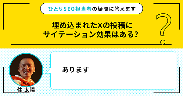 ひとりで頑張るSEO担当者さんの悩みに答える本連載。今回の質問は「埋め込まれたXの投稿にサイテーション効果はある?」です。この回答は「あります」です。