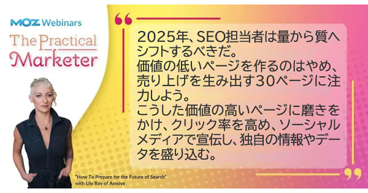 2025年、SEO担当者は量から質へシフトするべきだ。価値の低いページを何千ページも作成するのではなく、売り上げを生み出す30ページに注力しよう。こうした価値の高いページに磨きをかけ、独自の調査結果を裏付けとして用い、クリック率を高め、ソーシャルメディアで宣伝する。このように「質」を重視する戦略はグーグルの狙いに沿っており、今後ペナルティを受けるリスクを最小限に抑えられる。