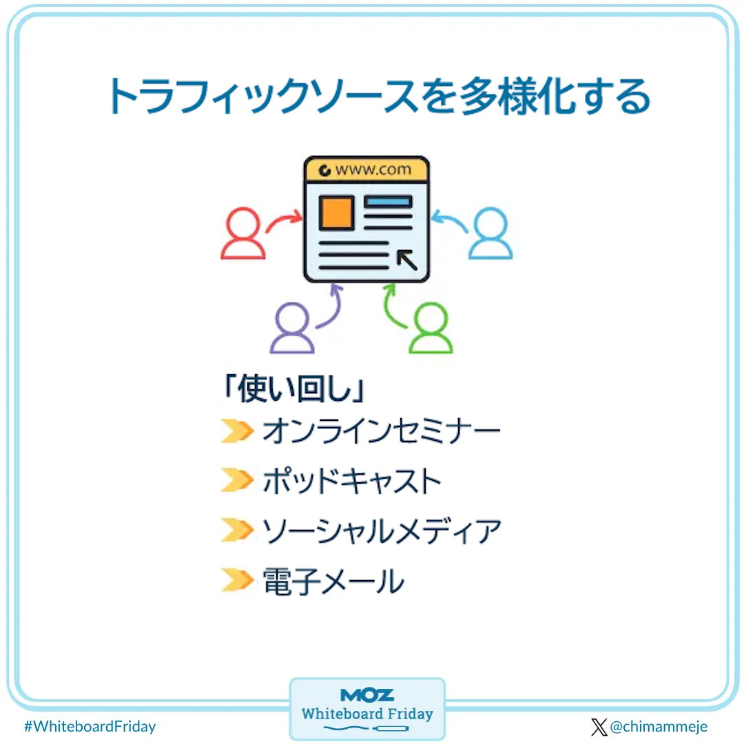 しかし、それはどういうことだろう? トラフィックソースを多様化するには、どうすればいいのだろうか? 私たちは長い間、グーグルに頼りすぎていた。鍵は「使い回し」にあると私は考えている。