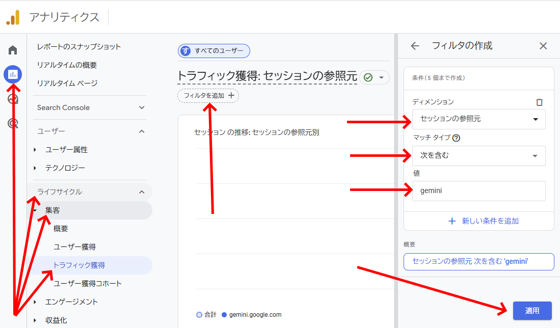 ※Web担編注 手元の環境では、「セッションのキャンペーン」でフィルタしても調査できなかった。フィルタするディメンションを「セッションの参照元」にして、「次を含む」で「chatgpt」や「gemini」を指定すれば調べられた。