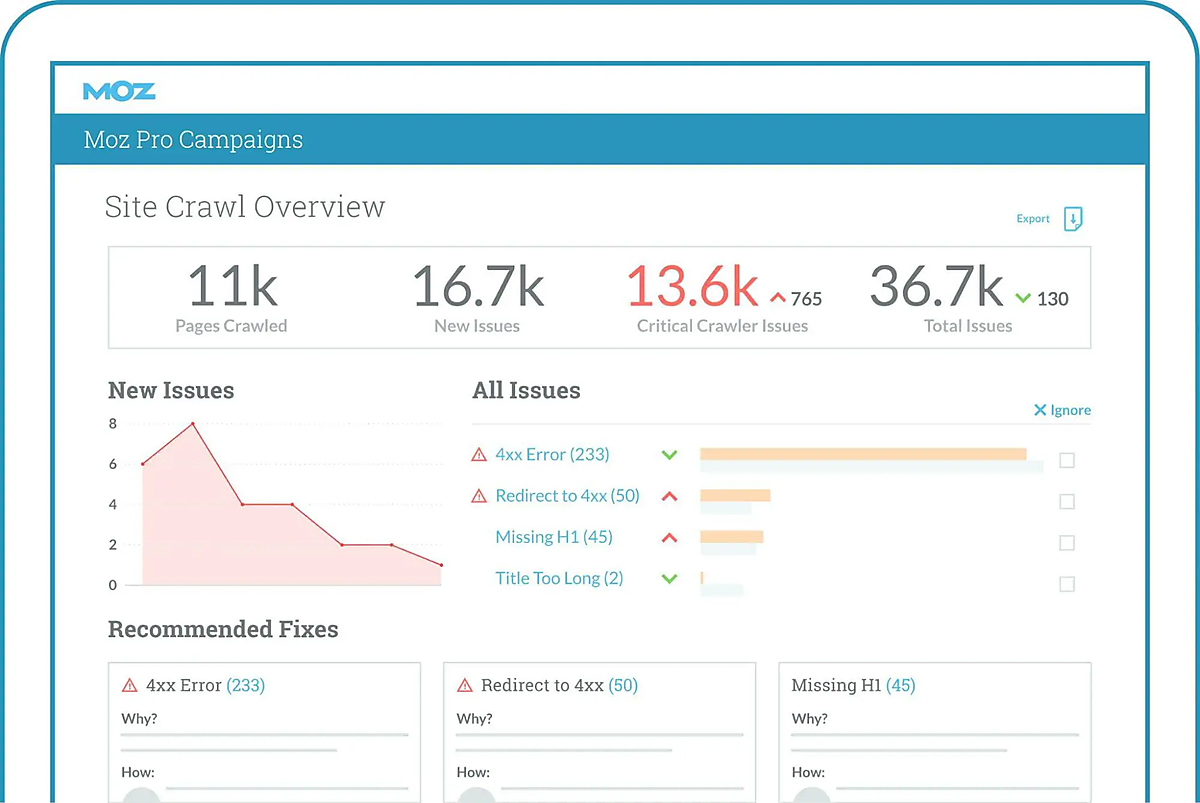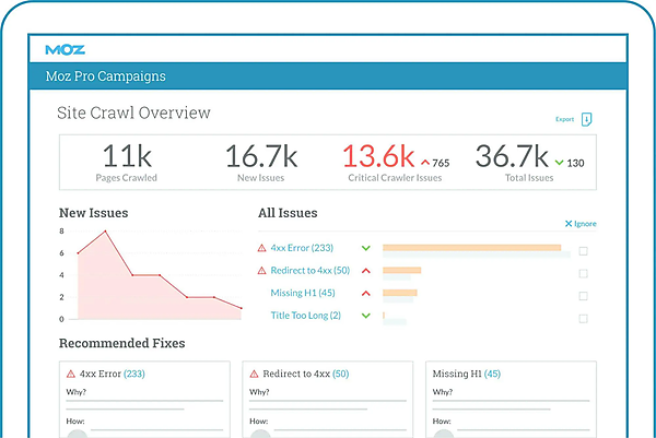より包括的なソリューションを探しているなら、Moz ProのSite Crawlを試してみよう。Horsemanはメタデータの最適化とキーワード抽出に重点を置いているが、MozのSite Crawlはリダイレクト、クロールエラー、メタデータの欠落など、より幅広い問題を特定し、その影響に基づいて修正に優先順位を付けている。