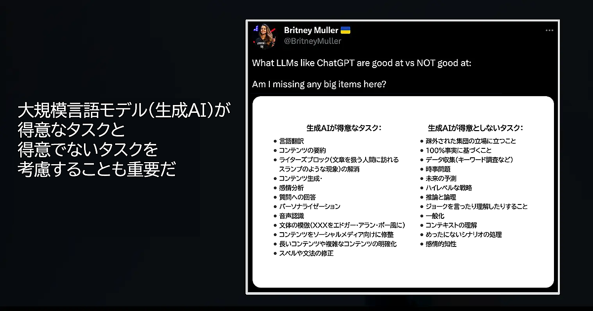 ブリトニー・ミュラー氏が強調しているように、ChatGPTのような生成AIが得意とする特定のタスクもあれば、生成AIで自動化すべきではないタスクもある。